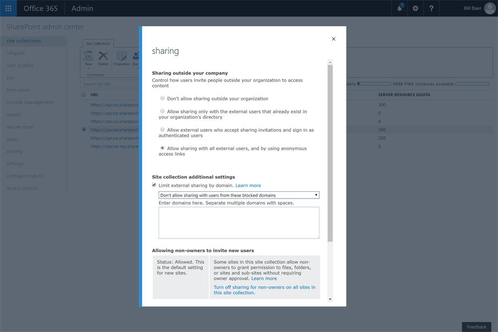 Administrators can list the email domains in the allow list or the deny list to configure external sharing or to limit sharing invitations. It helps to limit particular business partner or external user for sharing needs.