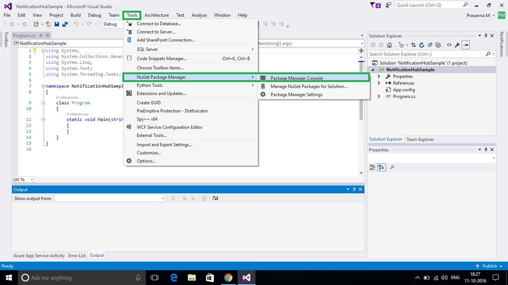 Once the project creation is successful, click Tools, Click NuGet Package Manager and click Package Manager console.