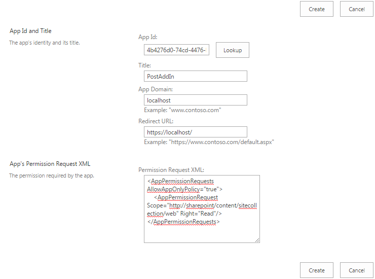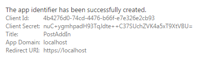 - Click Create button, which registers the add-in and returns the success message with created information.