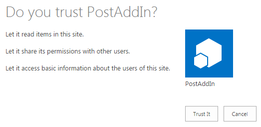 Once the Add-In is registered, we have to set the permissions for that add-in to access the SharePoint data. We will set the Read permission level to the web scope, so that we will be able to read the web information.