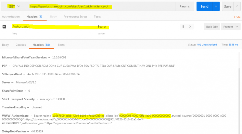 In response header, we will get WWW-Authenticate as one of the headers and that contains the necessary information required for the next step. The realm value contains the tenant id for the SharePoint Online site and clientid value contains the resource information (we’ll use it later).