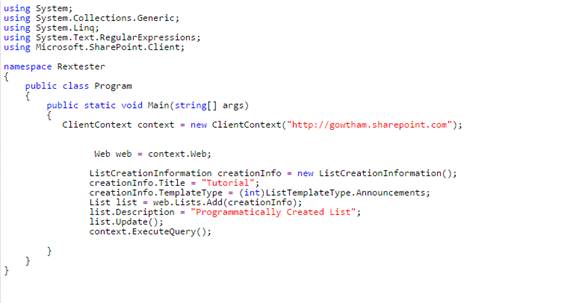 - ClientContext context = new ClientContext("http://gowtham.sharepoint.com");