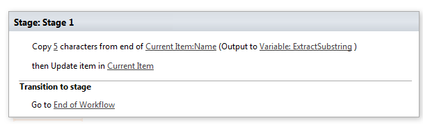 In this example, I have copied last 5 characters from end of “Name” field and stored it in a “ExtractSubstring” string variable and updated the current item “Notes” field to display the output string.