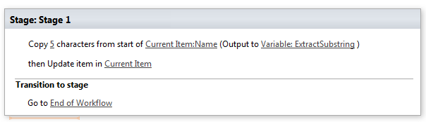 In this example, I have copied 5 characters from start of “Name” field and stored it in a “ExtractSubstring” string variable and updated the current item “Notes” field to display the output string.