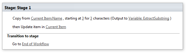 In this example, I have copied a substring starting at a specified index 3 for a specified number of characters from “Name” field and storing it in a “ExtractSubstring” string variable and updating the current item “Notes” field to display the output string.