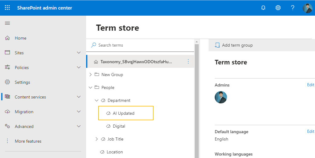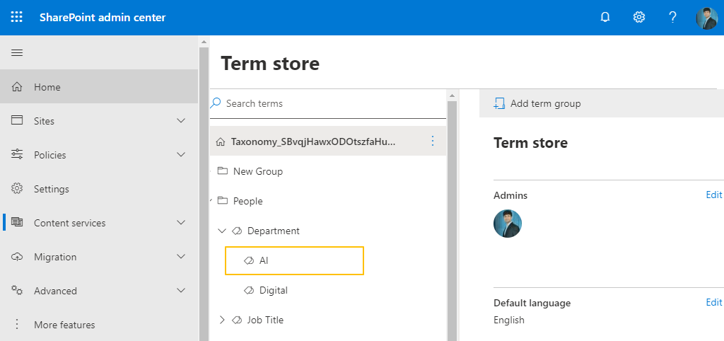 - "@odata.context": "https://testinglala.sharepoint.com/_api/v2.1/$metadata#termStores('root')/groups",