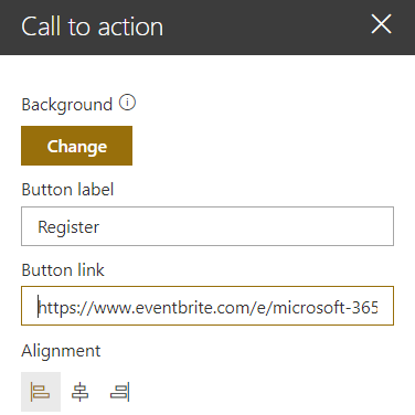 Edit the web part. In the properties pane, update the background image, label, and link. Button alignment (left, center, right) can be selected as per the need.