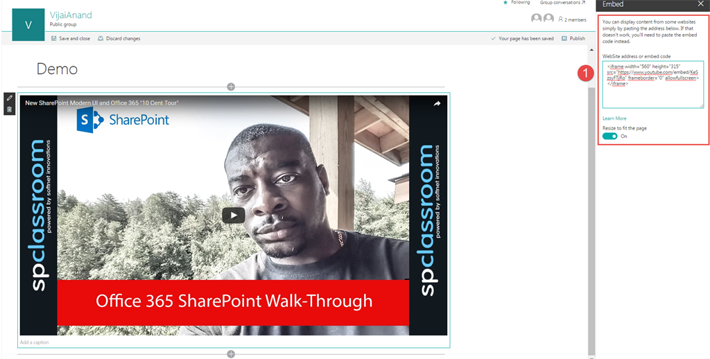 Copy and paste the embed code in the webpart properties tool pane. For example – I have copied the embed code from youtube video.
