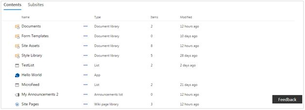 This section is updated with some UI changes and this one shows the lists and libraries and sub sites which are associated to the current site. The modern UI experience shows the lists and sub sites in client side tab view and also in a tabular format (This we have missed in previous SharePoint versions).