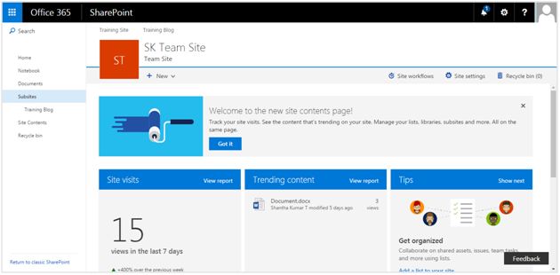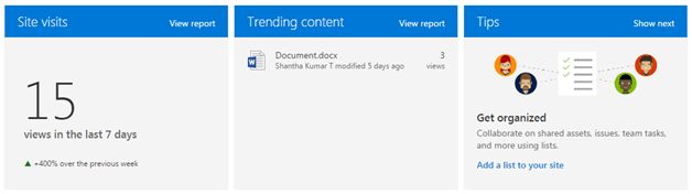 This is a new section with carousel feature added to the Site Contents page and admins are now able to track the reports for Site Visits and trending content and also it contains some tips to use this page.