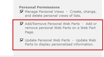 Clear the options “Add/Remove Personal Web Parts” and “Update Personal Web Parts”, to prevent the user personalizing the web part page.