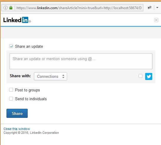If some business person or user wants to share their business related or any kind of information in social media, I will explain, below, the implementation of this in MVC Application .