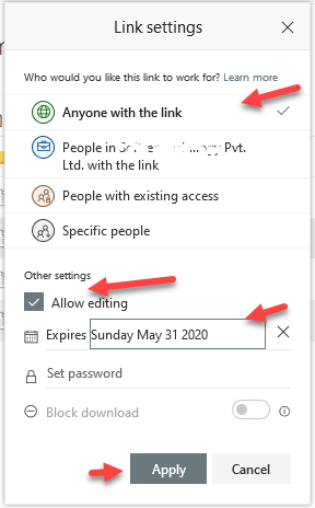 - Ticked mark on Allowing editing checkbox and enter an Expiry date for the link.