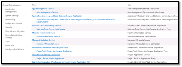 Once you click on manage Service Application, a list of Services will be displayed. From the list, select Project Server Service Application, as shown below.