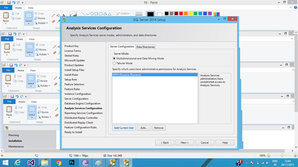 Now it's your choice; you can choose Windows Authentication Mode and SQL Server Authentication mode. My recommendation is SQL Server Authentication Mode. When you connect to SQL your user_name will be "sa" and password will be what you entered here.