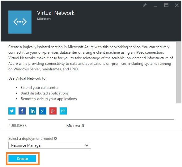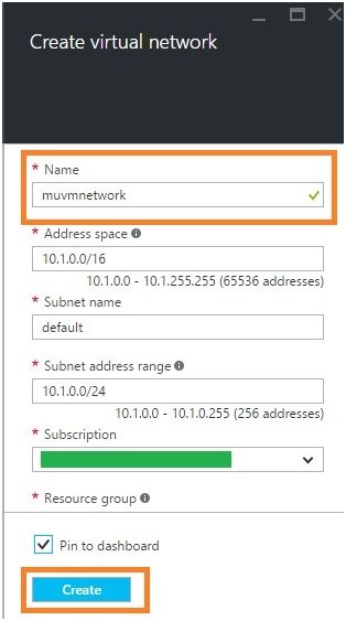 In the Virtual Network account blade, specify the desired configuration for the Virtual Network account (Name & Resource Group). Click Create button at the bottom of the screen to create the Virtual Network.