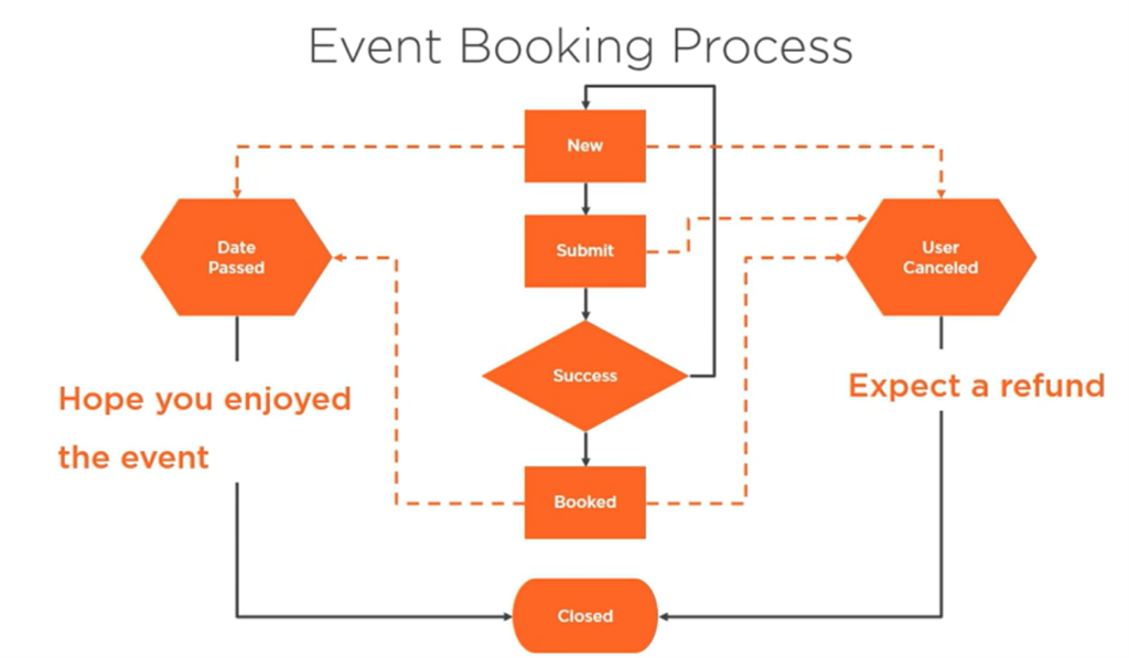 A booking in the booked state can be cancelled in which case it transitions to the closed state, and we tell the user to expect a refund.