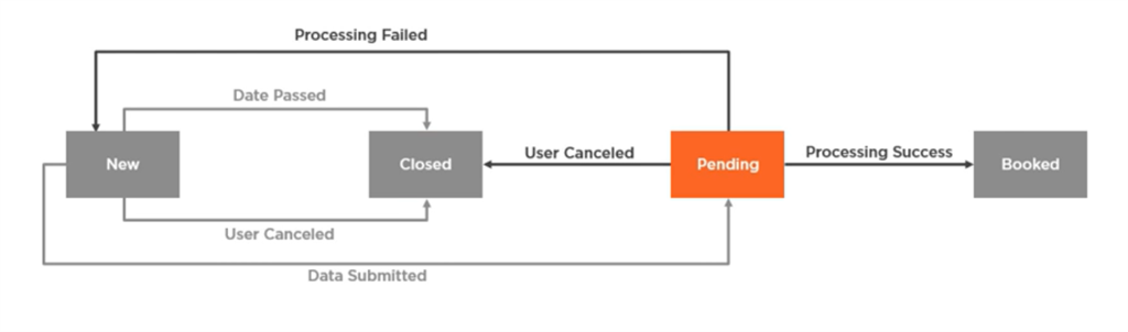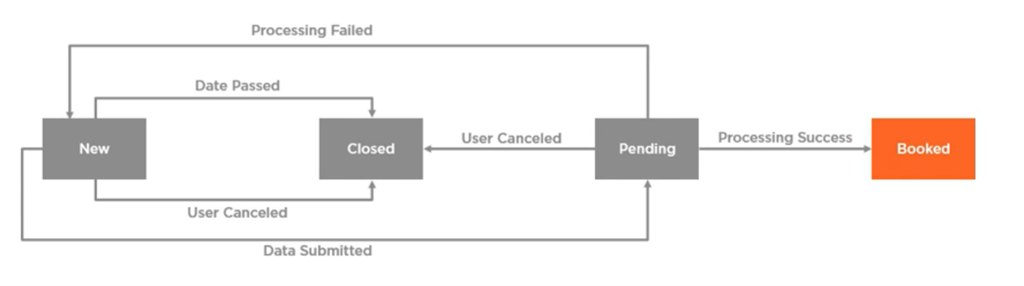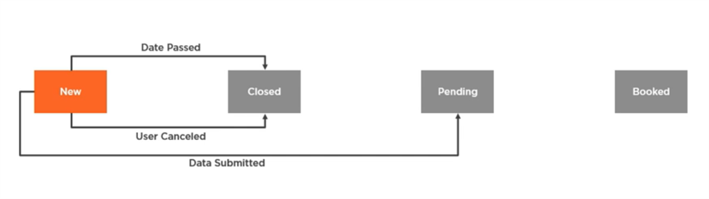 When in the new state, a booking can be cancelled resulting in it being in a closed state, or when the date for the event can pass also resulting in the booking being in a closed state.