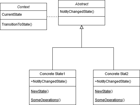 - A concrete state is a subclass of the abstract state that implements behaviours specific to a particular state of the context.