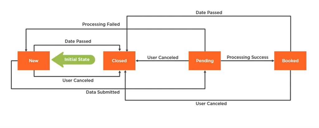 When the state is new, the user can go into submit state or also a user might cancel a booking and go into close-state or a date might expire and the object can go into close-state.