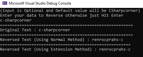- Console.WriteLine($ "Reversed Text (Using Extension Method) : {reverseText}");