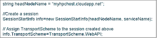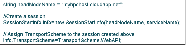 After hitting my head, I finally found out a way to do this. When we are talking about an interaction between the cloud and the on-premise, then the first thing that comes to our mind is the network. Here, definitely, TCP won’t work. The transport schemes available in the Azure HPC framework are few. After exploring them, I found one WebAPI and wow, that suited my requirement. I only used the WebAPI as the transport scheme, by modifying the name of the headnode to complete the host name (i.e. <headNodeName>.cloudapp.net), and I got my issue resolved. The sample code is as: