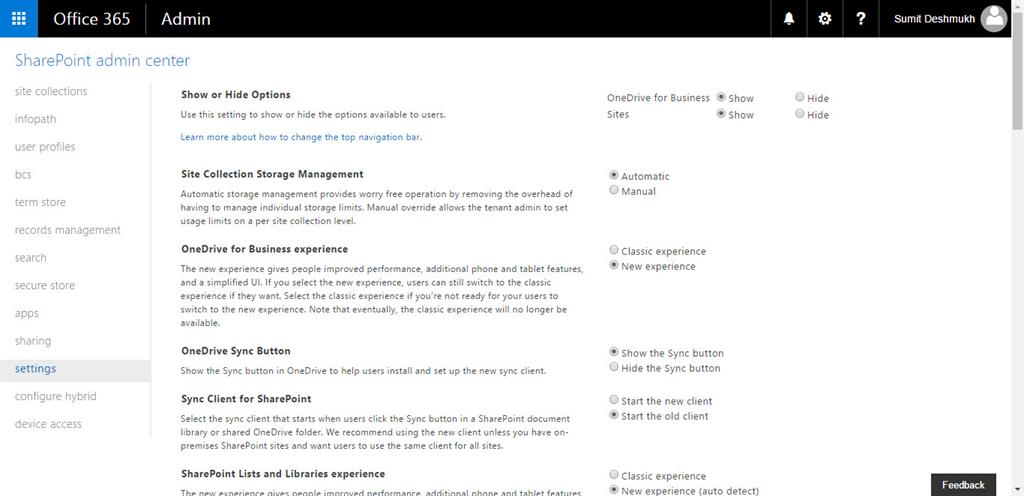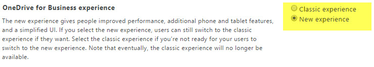 Also, for the One Drive for Business experience, have classic and new experience selection. The users have the selection choice to select the classic experience if they are ready otherwise they can opt for a new experience.