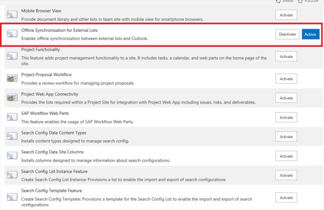 To achieve this function, we need to enable the site feature named Offline Synchronization for External List as follows.