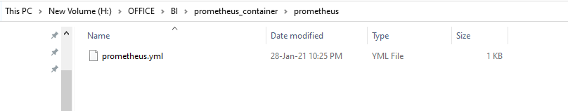 To setup Prometheus, from the root directory create a new folder (here we have named it Prometheus), and inside it create a new file named “prometheus.yml” which holds the main config of Prometheus.