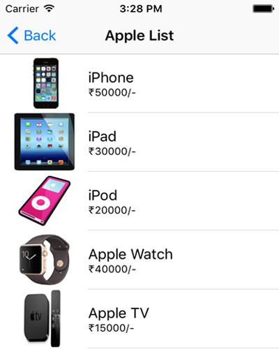 Now, build and run the project. If everything is correct, your app should run properly and you will see the below output. You can check the list of Apple products and Android products. The main difference between these two lists is the style of TableView.