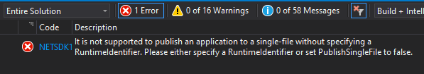 *It is not supported to publish an application to a single-file without specifying a RuntimeIndentifier. Please either specify a RuntimeIdentifier or set PublishSingleFile to false.
