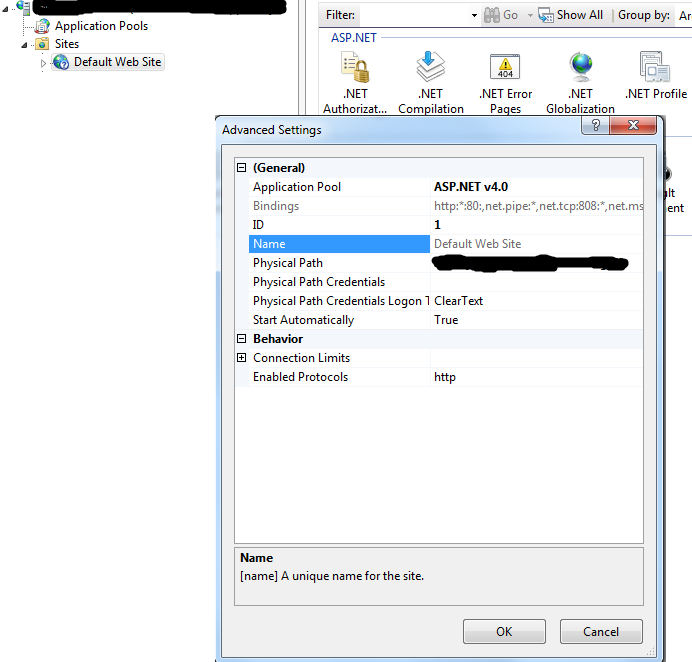 To fix the error, go to IIS Manager-Sites-Default Web Site->Manage Web Site-Advanced Settings. Set the Physical path e.g