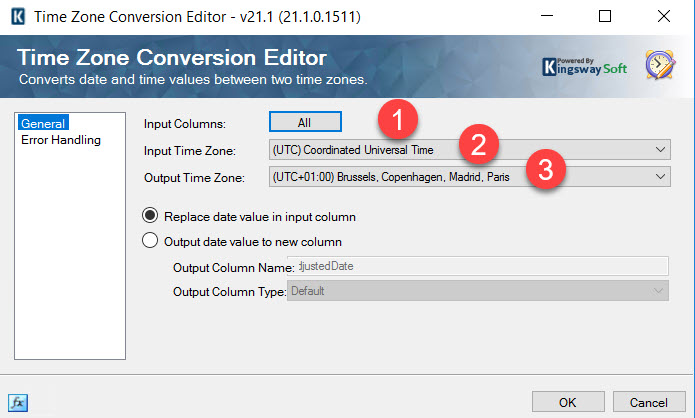 In this dialog under Input Columns we selected our date field. As this integration was done for the European region so we converted time zone from UTC to UTC+01:00.