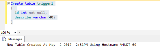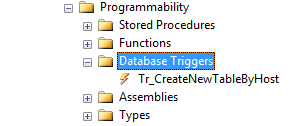 Here, the name of the trigger for a Create Table operation is named Tr_CreateNewTableByHost on DATABASE. That means when any table is created, the trigger will be fired.