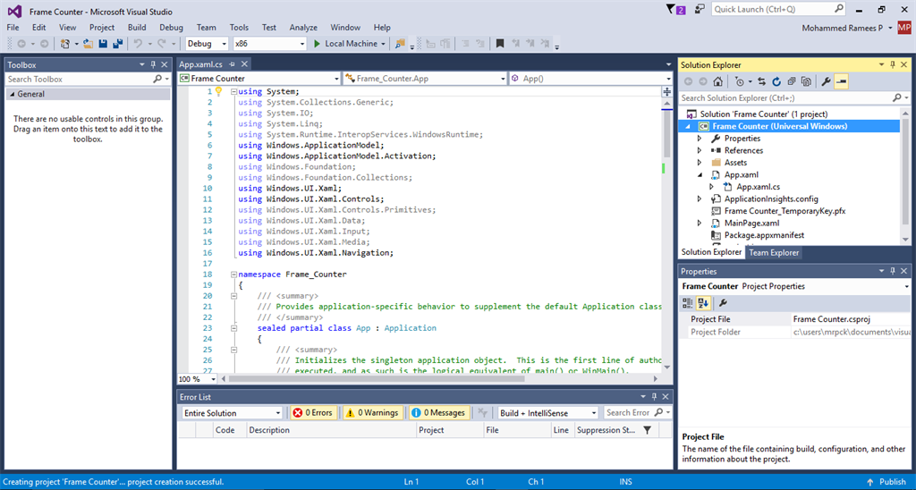 When running a Windows Universal App from Visual Studio 2015, you can see some values changing on the top left corner of the App. These indicate the frame rate and per frame CPU usage of the app while debugging. Here we will have a look at how to remove the same while running your application.