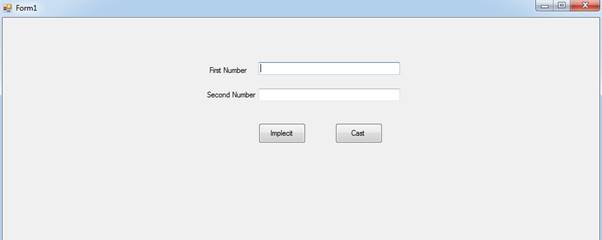 Implicit Conversion is done by the compiler itself. Let us see the example how the compiler does the conversion. Before starting the discussion, let us focus on the UI of the application. I have taken 2 textboxes and two buttons to perform both types of conversion.