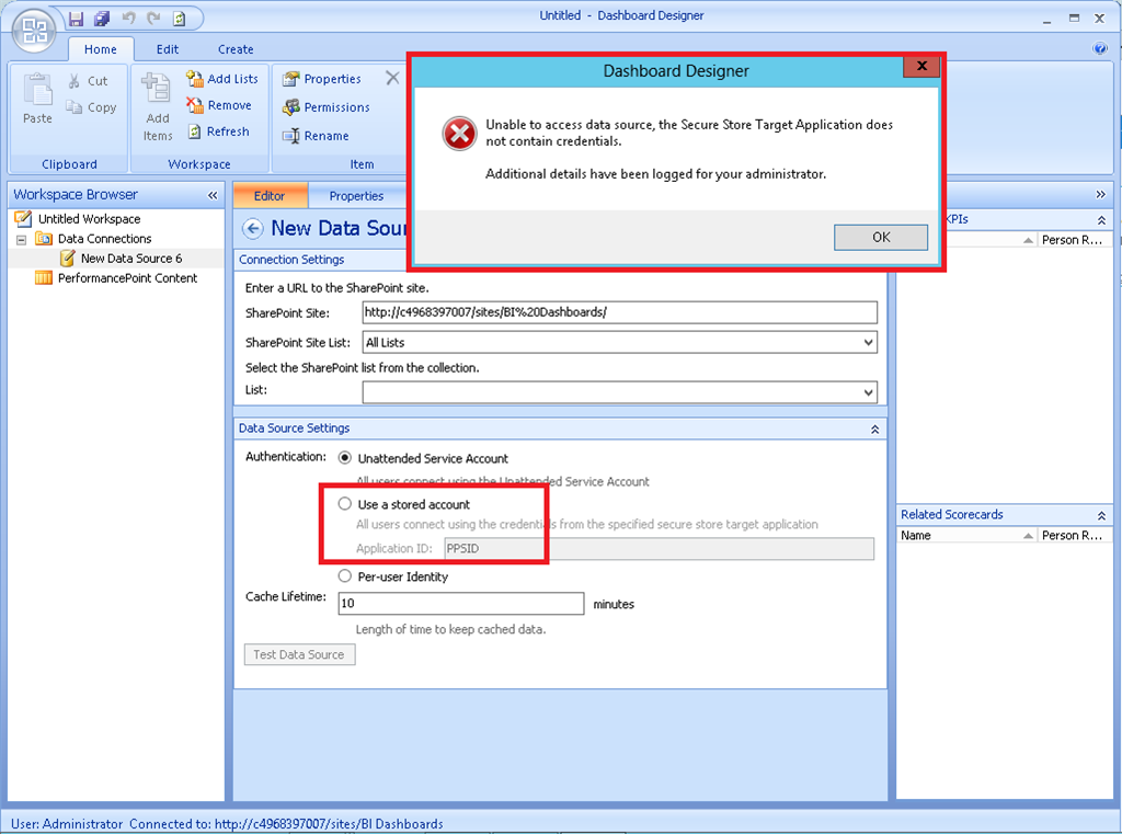 I configured the Performance Point Service in the SharePoint 2013 environment. I created a Business Intelligence site and was trying to create a dashboard using the Dashboard Designer.