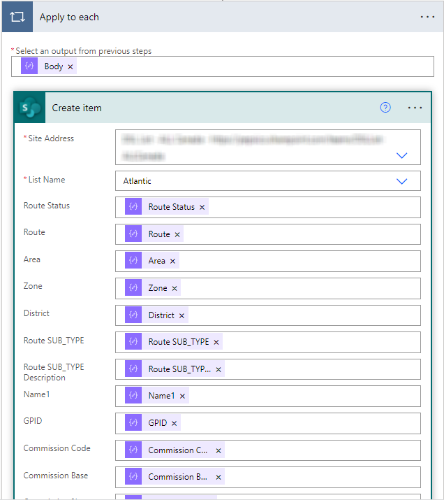 Unable to process template language expressions in action 'Create_item' inputs at line '1' and column '36753': 'The template language expression 'items('Apply_to_each')[' Route Status ']' cannot be evaluated because property ' Route Status ' doesn't exist, available properties are 'Route, Route Status, Area, Zone, District, Route SUB_TYPE, Route SUB_TYPE Description, Name1, GPID, Commission Code, Commission Base, Commission %, A-Z, A-Z-D, DSL, ZSL, ZBM, Admin, HRAdmin, Zone Name ER, RSR/Swing, Has a Swing?, NameAndRoute, ALL Swing Routes, Type1 Code