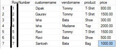 - Select ROW_NUMBER() over(order by customername) ROWNUMBER,Customername,vendorname,product,price from #SaleTable