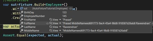 var sut = fixture.Build < Employee > ().With(a => a.FirstName, firstName).With(a => a.MiddleName, middleName).With(a => a.LastName, lastName).Create();