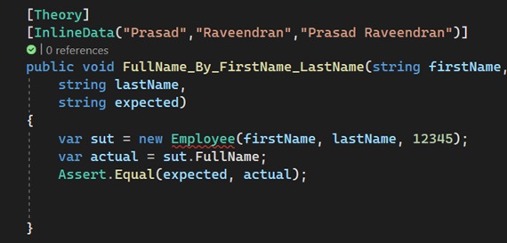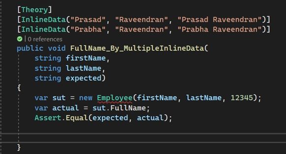 Here we are using the [Theory] attribute for passing the properties as parameters. The [InlineData] attribute is used to set the test data.