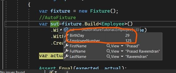 Here BirthDay and EmployeeNumber have random values assigned by AutoFixture.