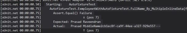 [xUnit.net 00:00:01.40] AutofixtureTest.ExmployeetWithAutoFixtureTest.FullName_By_AutoDataAttribute(sut: "Prasad", firstName: "Nair", middleName: "Raveendran", lastName: "Prasad Nair Raveendran", expected: "expectedc41ae6eb-d336-4c52-ae80-c00c5172296e") [FAIL]