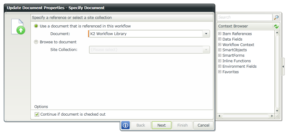 Go to K2 designer, drag and drop Update Document Properties step from the Documents workflow steps in the ribbon interface.