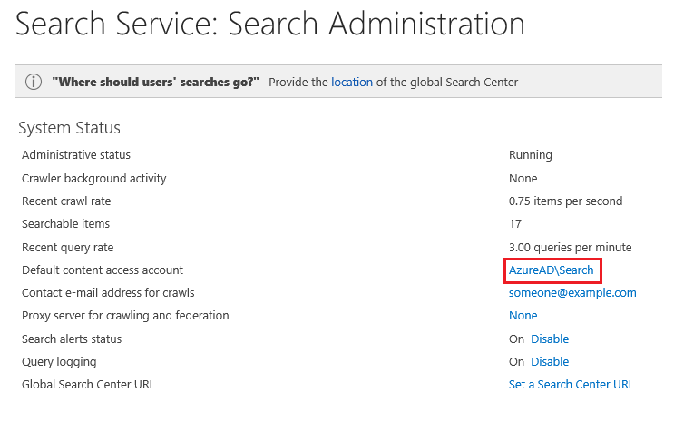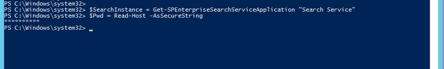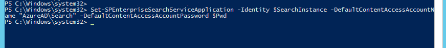- Set-SPEnterpriseSearchServiceApplication -Identity $SearchInstance -DefaultContentAccessAccountName "AzureAD\Search" -DefaultContentAccessAccountPassword $Pwd