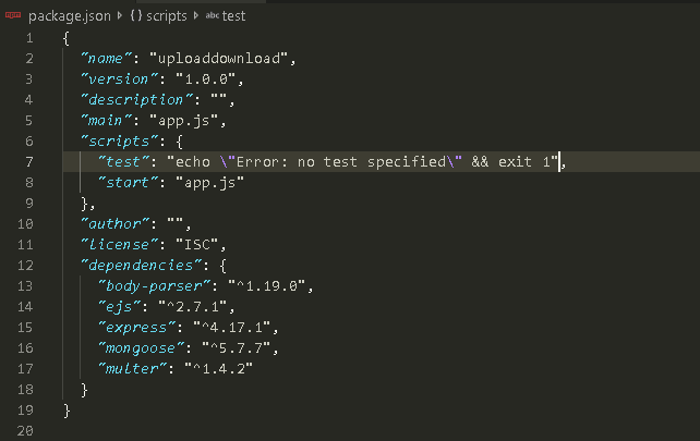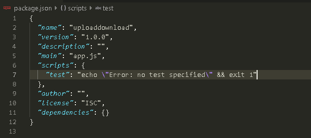 10. Go back to package.json file, and in scripts write start: app.js. This will be the application entry point.