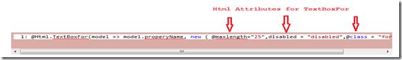 - @Html.TextBoxFor(model => model.properyName, new { @maxlength="25",disabled = "disabled",@class = "form-control" })