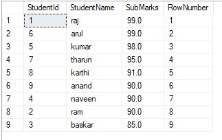 - Select *,ROW_NUMBER() Over(Order by SubMarks desc) as RowNumber From StudentMark