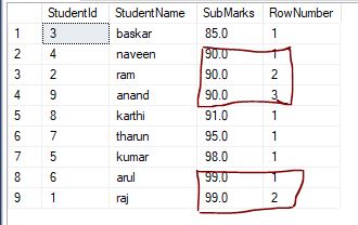- Select *,ROW_NUMBER() Over(Partition by SubMarks Order by SubMarks) as RowNumber From StudentMark