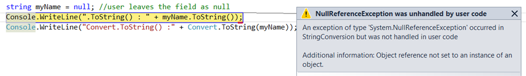 Now, we got the NullReferenceException with .ToString(); and now move to the next line. See what will happen?